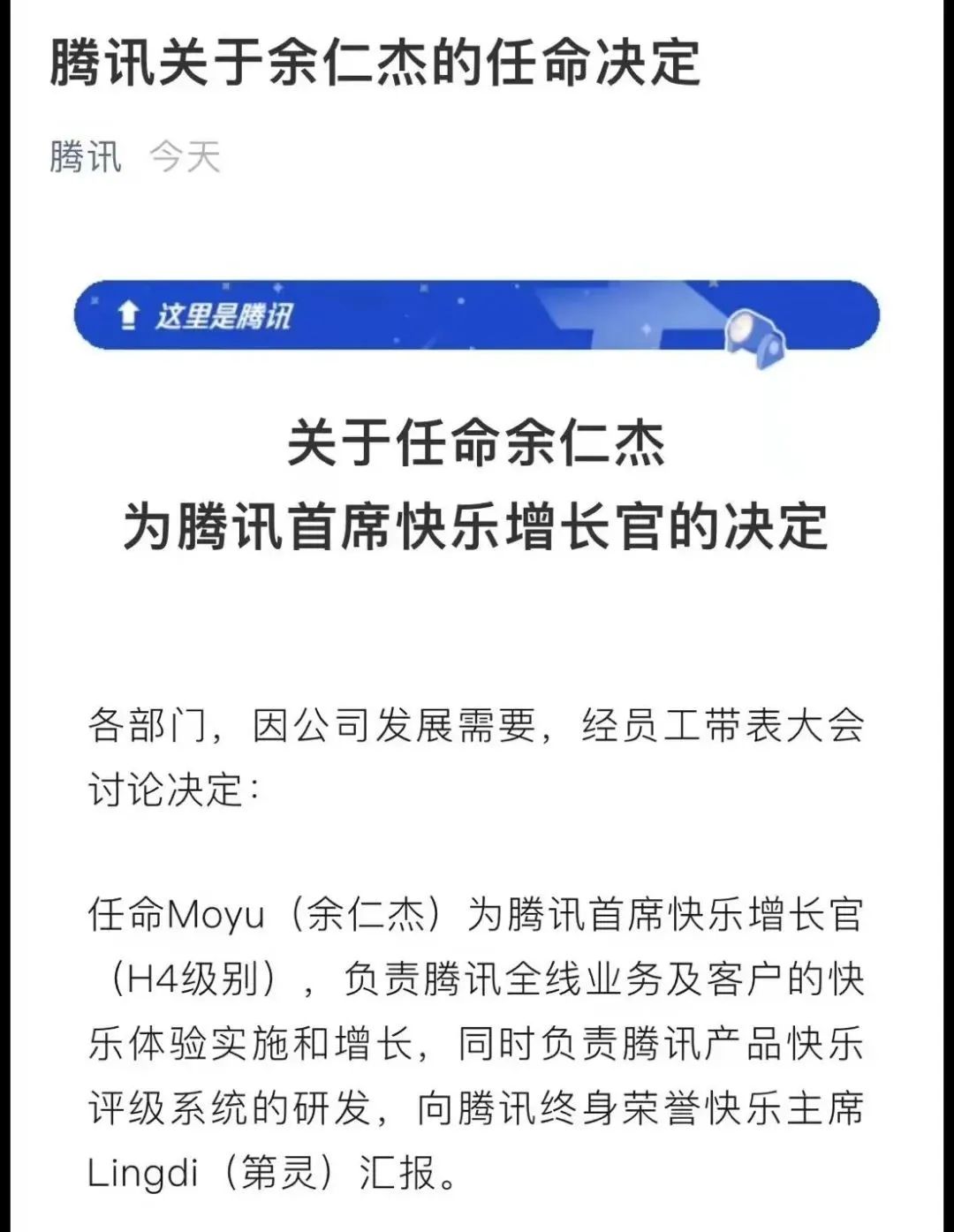 去年愚人节,腾讯官方微信公众号今日发文称,任命余仁杰为腾讯首席快乐增长官(H4级别),负责腾讯全线业务及客户的快乐体验实施和增长,同时负责腾讯产品快乐评级系统的研发,向腾讯终身荣誉快乐主席Lingdi(第灵)汇报。