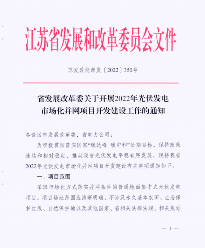 4月1日,江苏发改委印发《关于开展2022年光伏发电市场化并网项目开发建设工作的通知》,就光伏市场化项目申报条件给出相关要求。