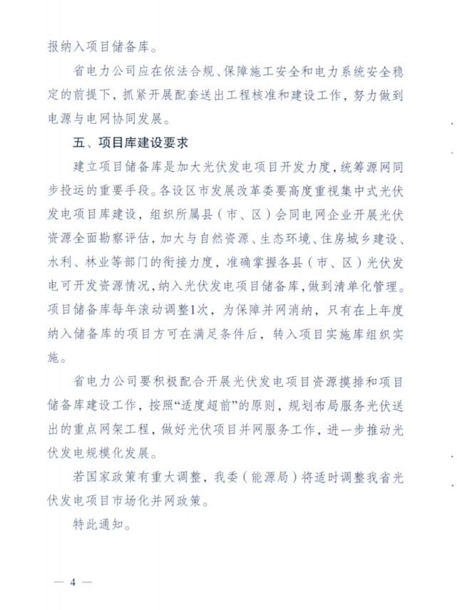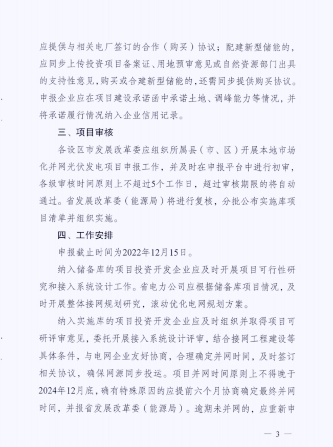 储备库项目要及时开展可行性研究和接入系统设计工作,省电力公司要根据储备库项目及时开展整体接网规划和研究。实施项目要合理确定并网时间,最晚在2024年12月底并网,如有特殊情况可申请延迟半年。省电力公司要按照"适度超前”的原则,规划布局服务光伏送出的重点网架工程。