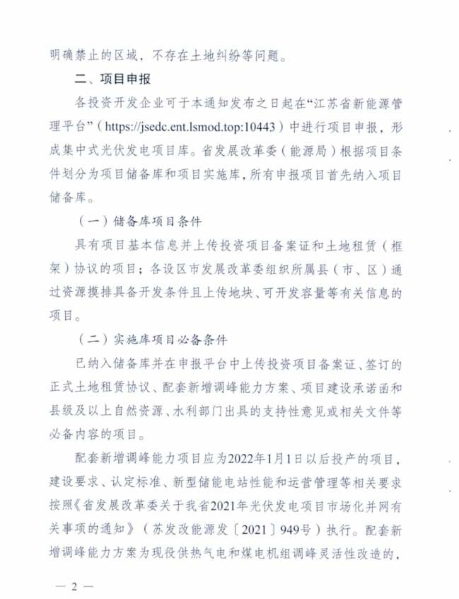 需要注意的是,配套新增调峰能力应为2022年1月1日后投产的项目,各项相关要求按照2021年下发的《关于我省2021年光伏发电项目市场化并网有关事项的通知》要求为准,即江苏省长江以南地区新建光伏发电项目原则上按照功率8%及以上比例配建调峰能力(时长2小时,下同),长江以北地区原则上按照功率10%及以上比例配建调峰能力。