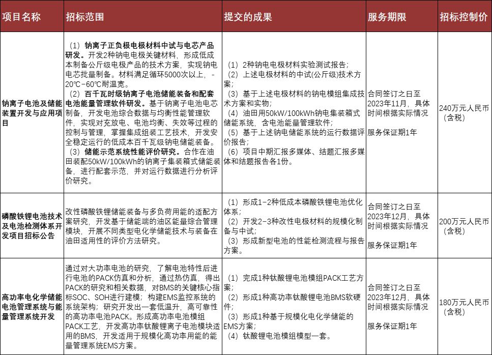 4月2日,中国石油招标投标网显示,中国石油连续发布3条储能相关招标文件,分别是钠离子电池及储能装置开发与应用项目、磷酸铁锂电池技术及电池检测体系开发项目、高功率电化学储能电池管理系统与能量管理系统开发。