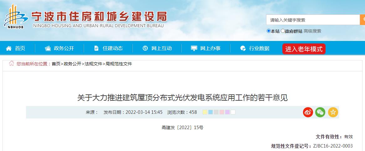 4月6日,宁波市住房和城乡建设局、宁波市发展和改革委员会、宁波市财政局宁波市能源局、宁波市机关事务管理局发布关于大力推进建筑屋顶分布式光伏发电系统应用工作的若干意见。意见提到,政府(含国有企业,下同)投融资新建建筑必须按照同步规划、同步设计、同步施工、同步验收的要求,在建筑屋顶配套安装光伏发电设施,基本实现屋顶光伏建筑一体化型式全覆盖。
