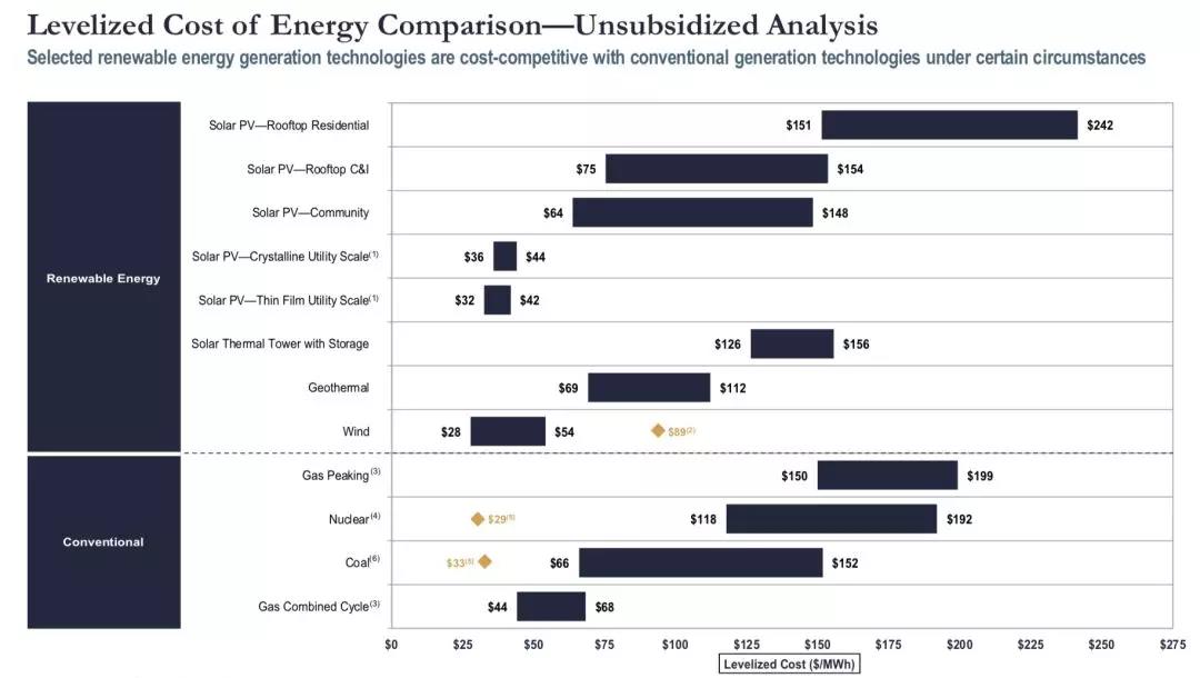 在不考虑联邦政府税收优惠的情况下,美国各类能源发电平准化成本的区间如下: