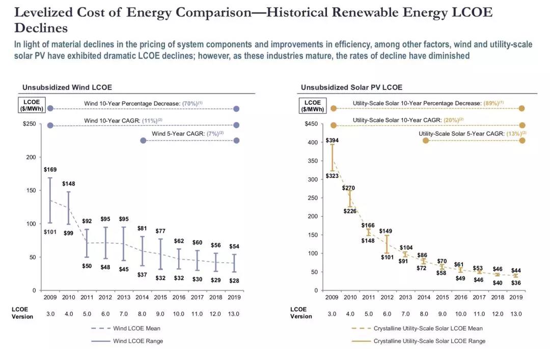 从平准化成本变化趋势来看,2009年到2019年陆上风电LCOE下降70%,10年来年平均下降11%;大型地面光伏LCOE下降89%,10年来年平均下降20%。
