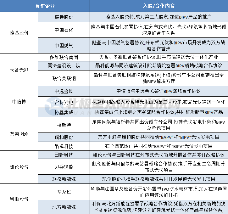 天合光能推出第三代BIPV解决方案“天能瓦”一体成型屋顶,并与绿色建筑集成服务领域的头部企业多维联合集团签署了战略合作协议。晶科分别与同济大学建筑设计研究院(集团)有限公司都境院、联合美联钢结构签署战略合作框架协议,计划在BIPV光伏建筑一体化领域展开多维度、深入合作。光伏支架龙头中信博推出了智顶、双顶及睿顶三种针对新旧屋顶解决方案产品后,携手中远金风、固德威在BIPV领域展开全面合作。