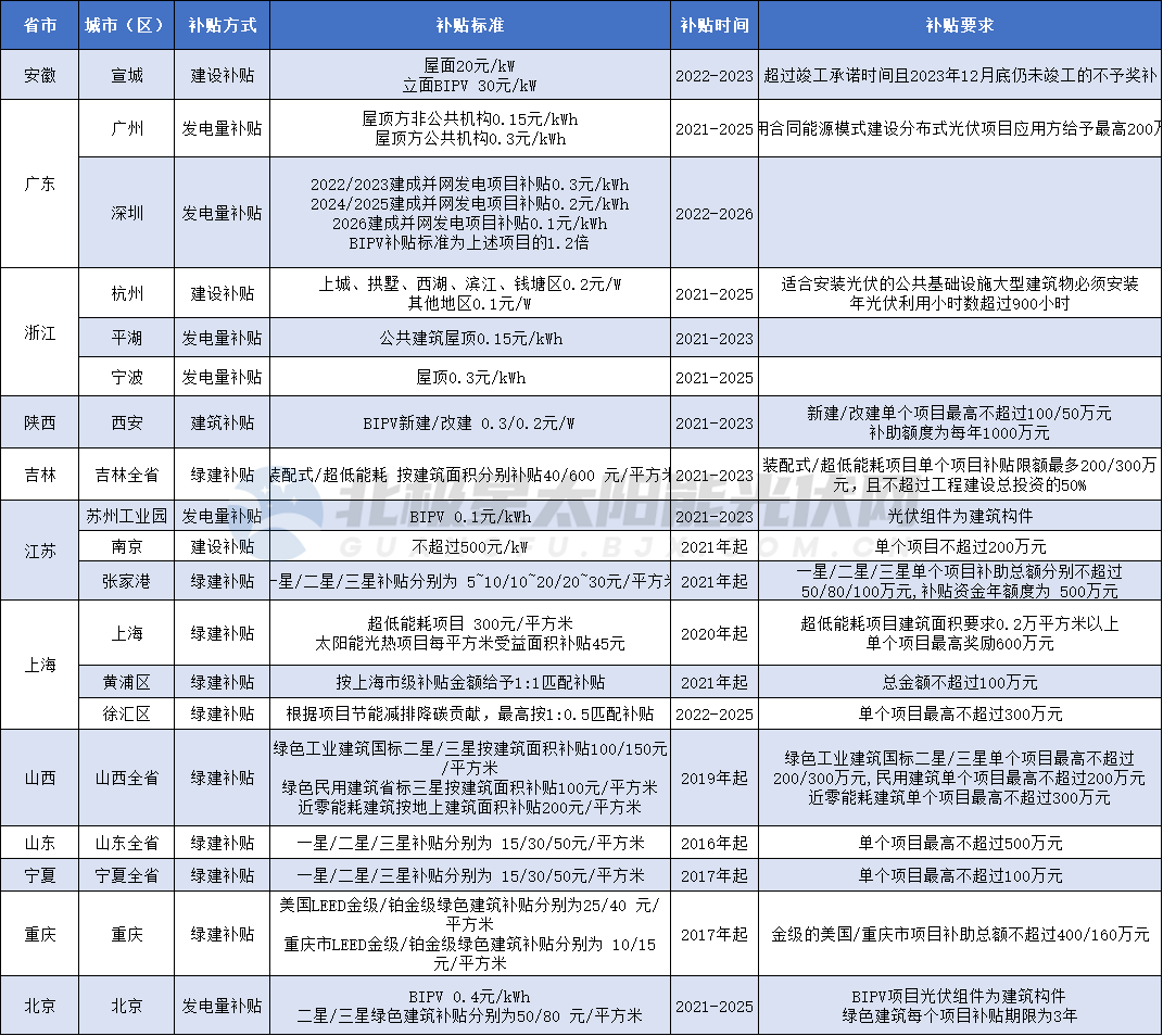 除此之外,多地政府对于新建或已建成的光伏建筑进行补贴,其中针对BIPV发电补贴力度最大的是安徽省宣城对BIPV项目补贴30元/千瓦,深圳对BIPV项目补贴是普通项目0.1-0.3元/kWh的1.2倍,北京市对BIPV项目补贴0.4元/kWh,西安、苏州工业园对BIPV项目补贴范围在0.1-0.3元/kWh。