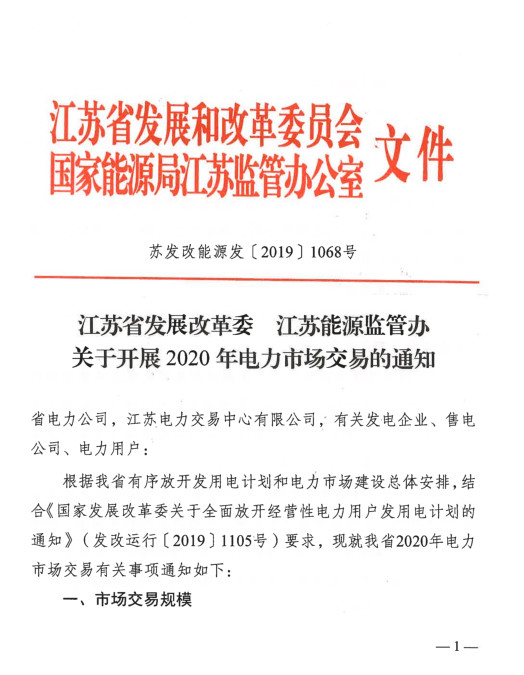 11月20日,江苏省发展和改革委员、国家能源局江苏监管办公室联合发布《关于开展2020年电力市场交易的通知》(苏发改能源发【2019】1068号)。
