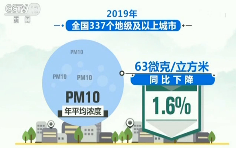 公报显示,环境空气质量改善成果进一步巩固。2019年,全国337个地级及以上城市平均优良天数比例为82.0%。PM2.5年平均浓度为36微克/立方米,同比持平。PM10年平均浓度为63微克/立方米,同比下降1.6%。