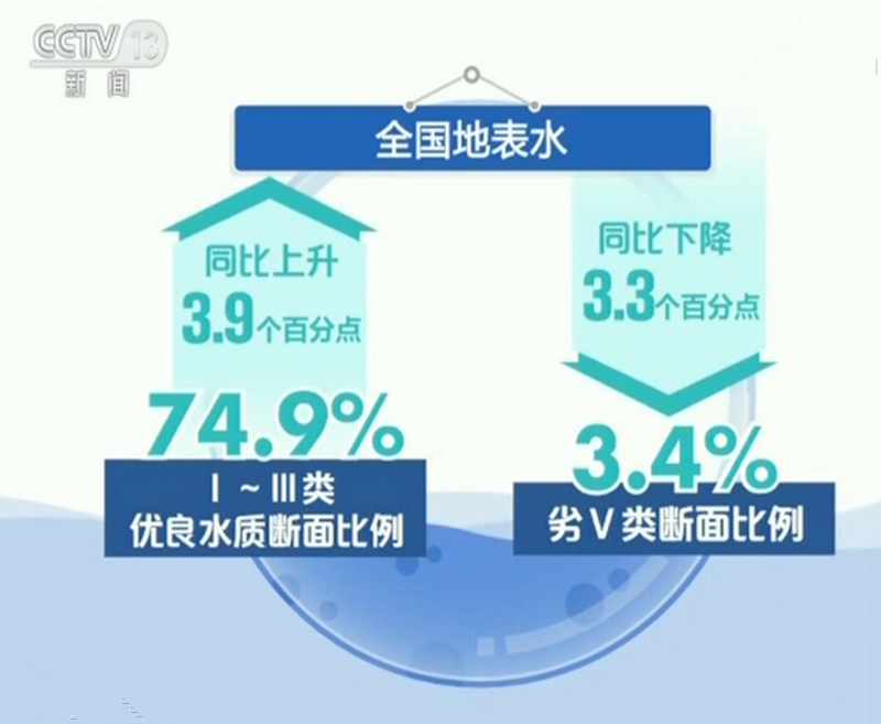 水环境质量持续改善。全国地表水Ⅰ~Ⅲ类优良水质断面比例为74.9%,同比上升3.9个百分点;劣Ⅴ类断面比例为3.4%,同比下降3.3个百分点。902个在用集中式生活饮用水水源监测断面(点位)中,830个全年均达标,占92.0%。