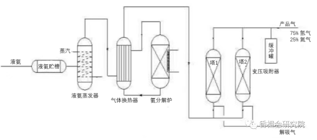 传统的氨分解变压吸附制氢工艺可分为两部分:氨分解和变压吸附纯化。液氨经预热器蒸发成气氨,然后在一定温度下,通过填充有催化剂的氨分解炉,氨气即被分解成含氢75%、含氮25%的氢氨混合气。其反应为: