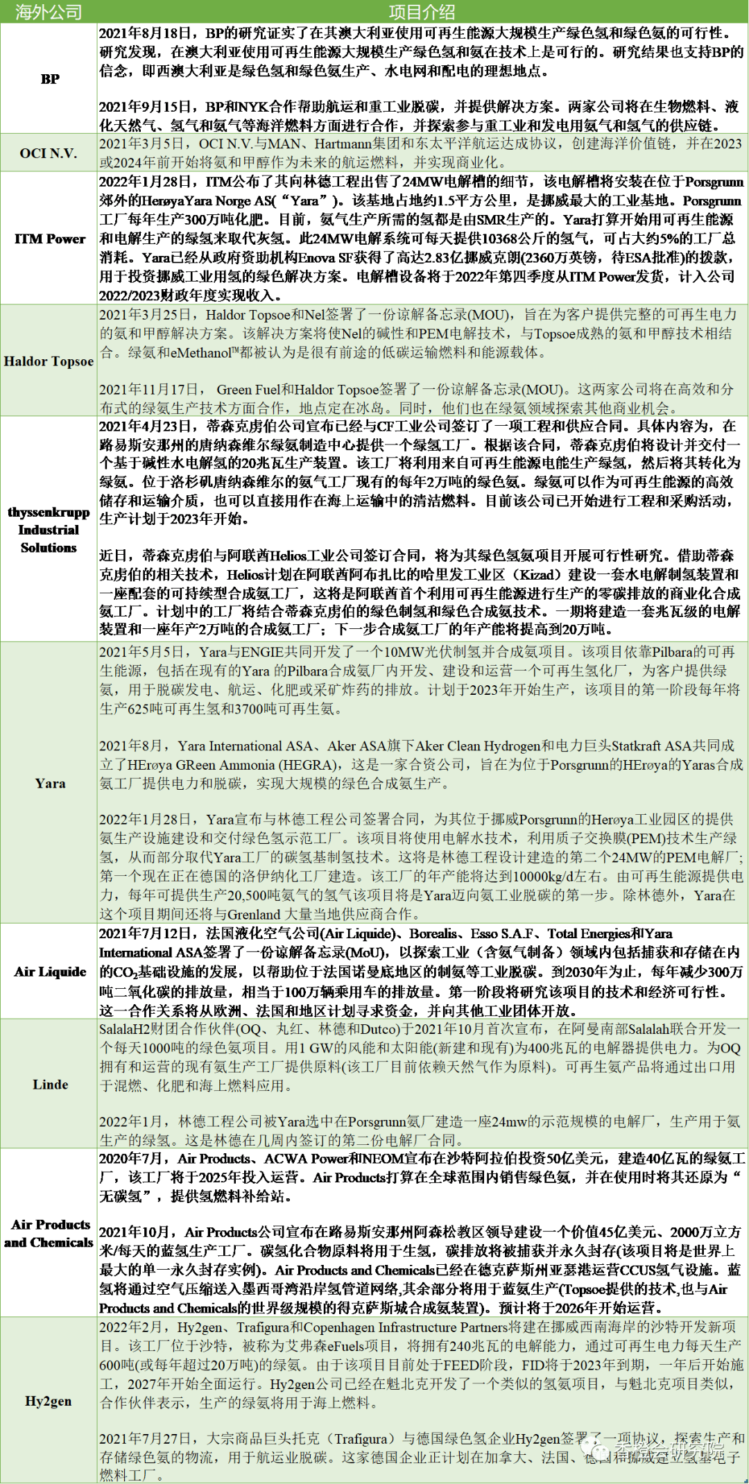 据香橙会研究院调查,全球绿氨市场的主要企业有:BP,OCI N.V., ITM Power,Haldor Topsoe,thyssenkrupp Industrial Solutions,Yara, Air Liquide,Linde,Air Products and Chemicals,Hy2gen等。