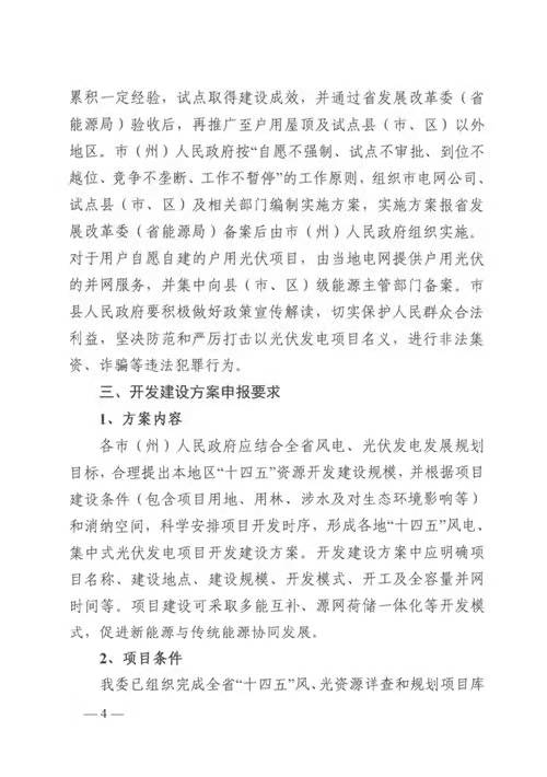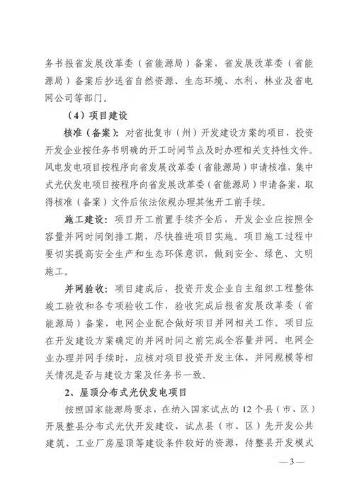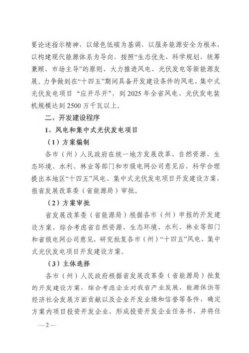 在开发程序上,文件要求各州市政府在统一发改委、自然资源、生态环境、水利、林业等部门和市级电网公司意见后,提出开发建设方案,报省发改委审批。开发建设方案中应明确项目名称、建设地点、建设规模、开发模式、开工及全容量并网时间等。项目建设可采取多能互补、源网荷储一体化等开发模式,促进新能源与传统能源协同发展。