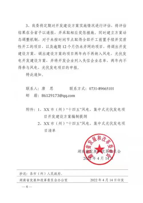 湖南省已完成全省“十四五”风、光资源详查和规划项目库的建设,原则上应从规划项目库中选取完全具备开发条件的项目纳入本次开发建设方案,其中风电项目应于2024年底前全容量并网,集中式光伏发电项目应于2023年底前全容量并网。