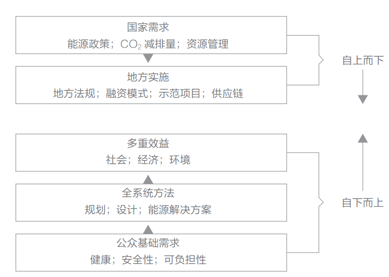零碳建成环境必须由人们的需求和意志以及国家和国际目标驱动,它们分别被视为是自下而上和自上而下的方法:没有自下而上的认同和行动,自上而下的策略就行不通;同样,自上而下的方法也需要在各地区实施,而不能完全依赖国家和国际的指令和规定。