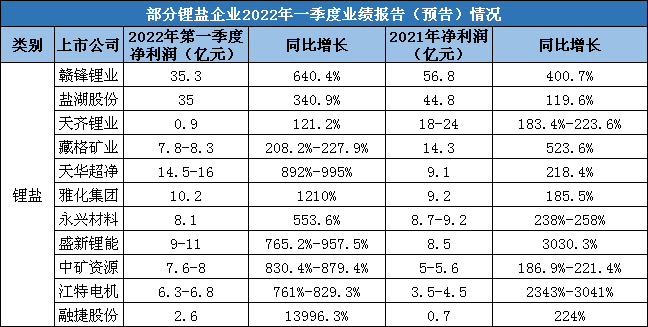 从上述业绩报告(预告)表中可以看出,雅化集团、盛新锂能、中矿资源、江特电机、融捷股份、天华超净的一季度净利润均超过去年全年净利润。