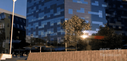 建筑的外立面采用黑色铝板为主要材料,并配有不规则玻璃幕墙。