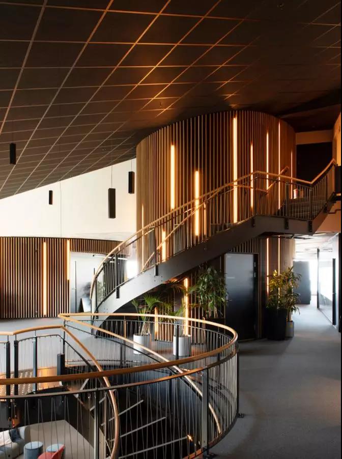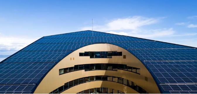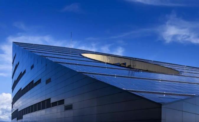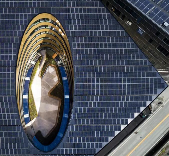 其倾斜的五角形屋顶和立面上部覆盖了近3000平方米的太阳能电池板,战略性地放置以获取尽可能多的太阳能。