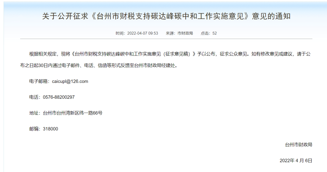 近日,浙江省台州市发布了关于公开征求《台州市财税支持碳达峰碳中和工作实施意见》意见的通知。