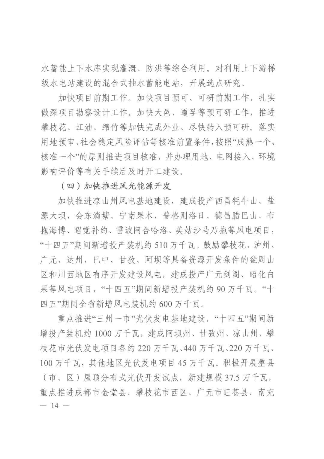 《规划》表示,2025年,可再生能源高质量发展取得新进展。“十四五”新增风电约600万千瓦,光伏发电约1000万千瓦。重点推进“三州一市”光伏发电基地建设,加快推进凉山州风电基地建设等。积极推动水电与风电、太阳能发电协同互补,推进金沙江上游、金沙江下游、雅砻江流域、大渡河中上游等水风光一体化可再生能源综合开发基地建设。加快新型储能示范推广。鼓励建设超高海拔风电、光伏发电实证实验基地、光伏储能试点项目。