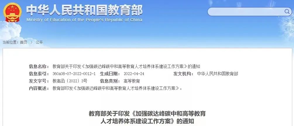 教育部关于印发《加强碳达峰碳中和高等教育人才培养体系建设工作方案》的通知