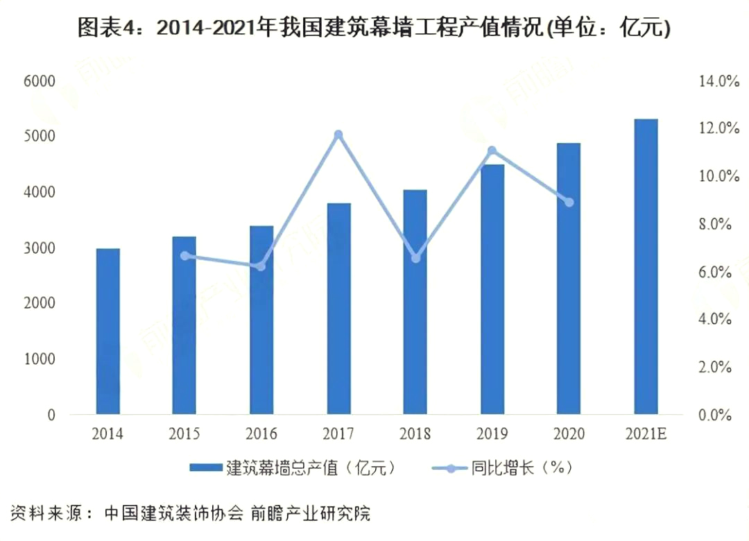 我国建筑幕墙工业从1978年开始起步,经过多年的发展,特别是21世纪90年代的高速发展,至21世纪初已成为世界第一幕墙生产大国和使用大国。当前,我国幕墙年产能远远超过1亿平方米,幕墙工程总值逐年增长,根据中国建筑装饰协会统计数据显示,建筑幕墙工程总产值已从2014年的3000亿元增长至2020年的4900亿元左右,2020年我国建筑幕墙工程产值增长幅度为8.9%。2021年我国建筑幕墙工程总产值约为5317亿元。
