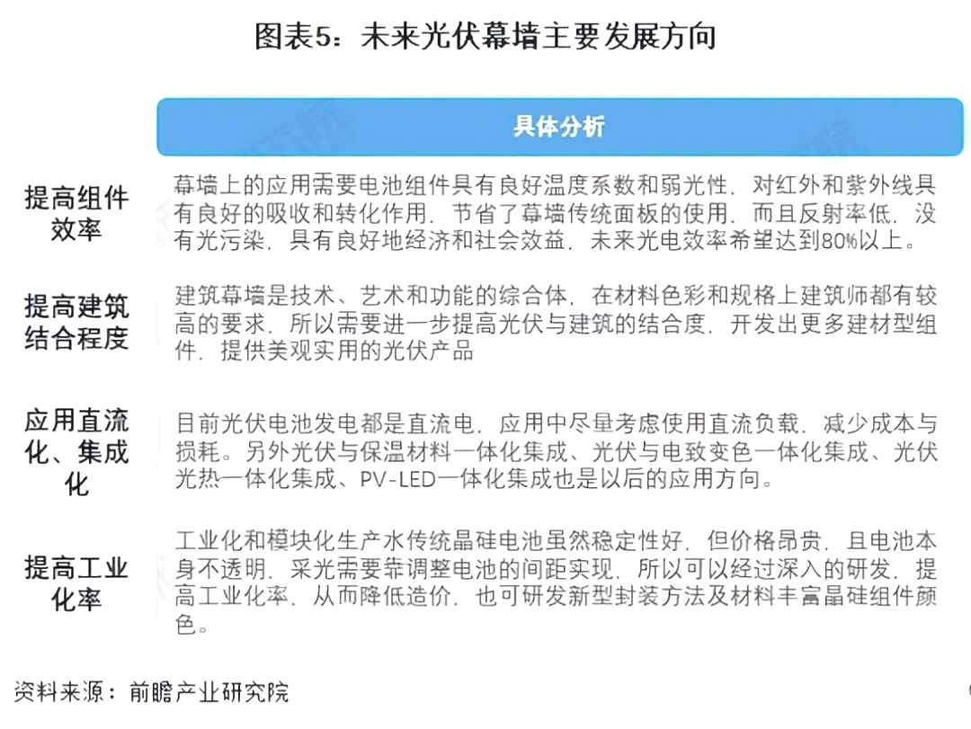 作为绿色节能的幕墙形式,实现了被动节能和主动产能完美结合的光伏幕墙必将成为幕墙行业发展的主流方向。综合来看,光伏幕墙发展方向主要有如下几点: