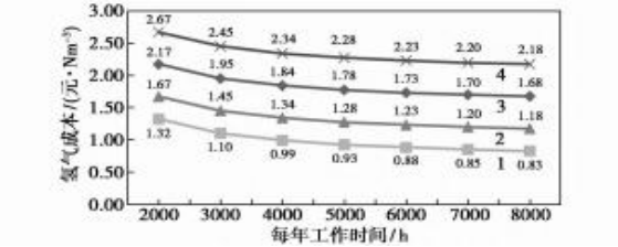 图表3 不同条件下制氢成本与电解槽工作时间的关系