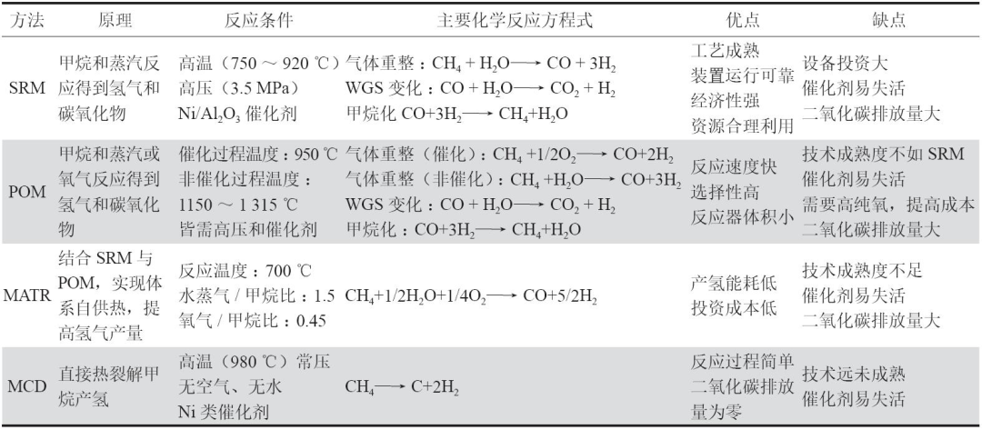 甲烷(CH4)作为天然气的主要成分,在所有碳氢化合物中具有最高的氢元素占比。因此以天然气为原料的甲烷制氢方法具有高制氢效率、最低的碳排放量、适用于大规模工业产氢等优点。甲烷制氢技术主要包括蒸汽重整法(SRM)、部分氧化法(POM)、自热重整法(MATR)、催化裂解法(MCD)。
