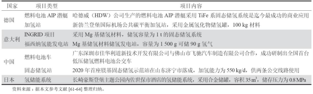 固态金属氢化物储运氢是利用储氢合金在一定温度和压力条件下的可逆吸/放氢反应来实现氢气储运的。氢在储氢合金表面分解为氢原子,扩散进入合金内部与其发生反应生成金属氢化物,氢即以原子态储存在金属内的四面体与八面体间隙位置。金属氢化物具有储氢体积密度大、安全、氢气纯度高、操作容易、运输方便、成本较低等优势。固态金属储氢的商业应用主要为潜艇、核电站、发电站、加氢站、便携式测试设备等(表3),如德国GKNHydrogen公司有10~265kg不同型号的固态储氢系统,可低压运行并100%可回收,无容量损失(材料消耗)等优势;美国ECDOvonic公司采用轻质碳纤维包卷形成的储氢罐,所含的金属氢化物可储存约3kg的氢气;丰田公司的氢动力汽车均采用了ECDOvonic公司的技术。目前,国内金属氢化物储氢应用还较少,正处于研发与示范阶段,提高金属氢化物的储氢量、降低材料成本、提高金属氢化物的可循环性等将是未来的研究重点。