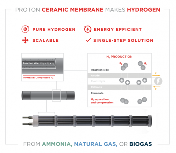 “有了我们的质子陶瓷膜,我们可以将天然气和氨等传统燃料制氢的不同步骤结合到一起,电化学气体分离为催化制氢提供热量。其结果是一个热平衡过程,使氢的能量损失接近于零。”