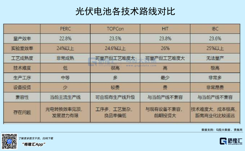 钙钛矿因有更高的光电转换效率以及更低的组件成本等优势,被业内认为可能有很强商业化前景的新一代光伏技术。据信达证券,钙钛矿单层电池理论效率可以达到31%,双节叠层可以达到35%,三节层更是可以达到45%。而现在主流的PERC转化效率理论极限为24.5%(目前已达23%)。另外,市场认为有可能成为下一代主流的TOPcon电池理论极限为28.7%,异质结(HJT)电池为27.5%。