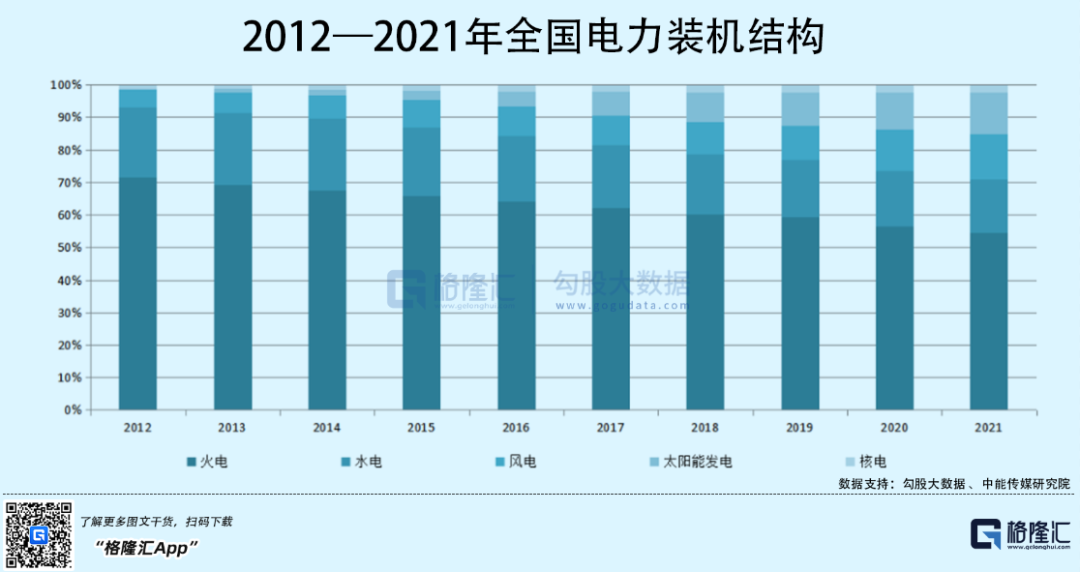 2021年发电结构中,火力、水力、风力、核能、光伏占发电总量的71%、14.6%、6.99%、5.02%、2.26%。