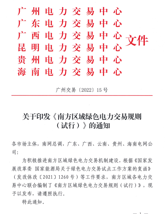 2022年5月,北京电力交易中心印发《北京电力交易中心绿色电力交易实施细则》,就国网区域绿电交易的定义、规则、机制等进行了明确。南方区域各电力交易机构联合编制印发《南方区域绿色电力交易规则(试行)》对以上问题进行了明确,并已与2月25日起实施。对上述问题进行了解释。