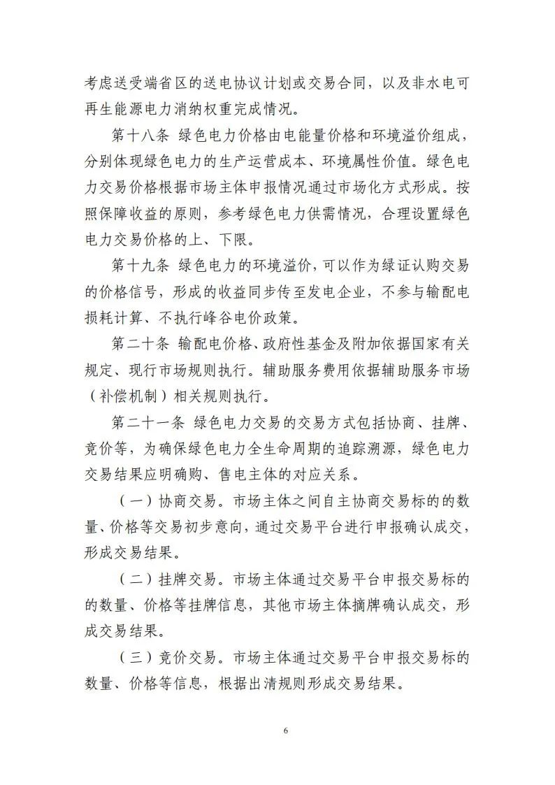 价格方面,绿色电力交易价格由市场主体通过双边协商、挂牌交易等方式形成。绿色电力交易价格应充分体现绿色电力的电能价值和环境价值,原则上市场主体应分别明确电能量价格与绿色环境权益价格。