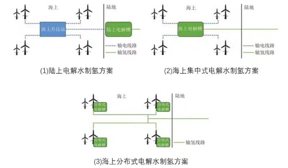 对于陆上电解水制氢方案,海上风电机组产生的电力经海底电缆、升压站等设施输送至陆上电解水制氢系统,其优点是具有较高的灵活性,制氢系统可以作为电网调峰的有效手段,在陆上完成氢气的制取和储运,也具有系统安装维护方便的优势。