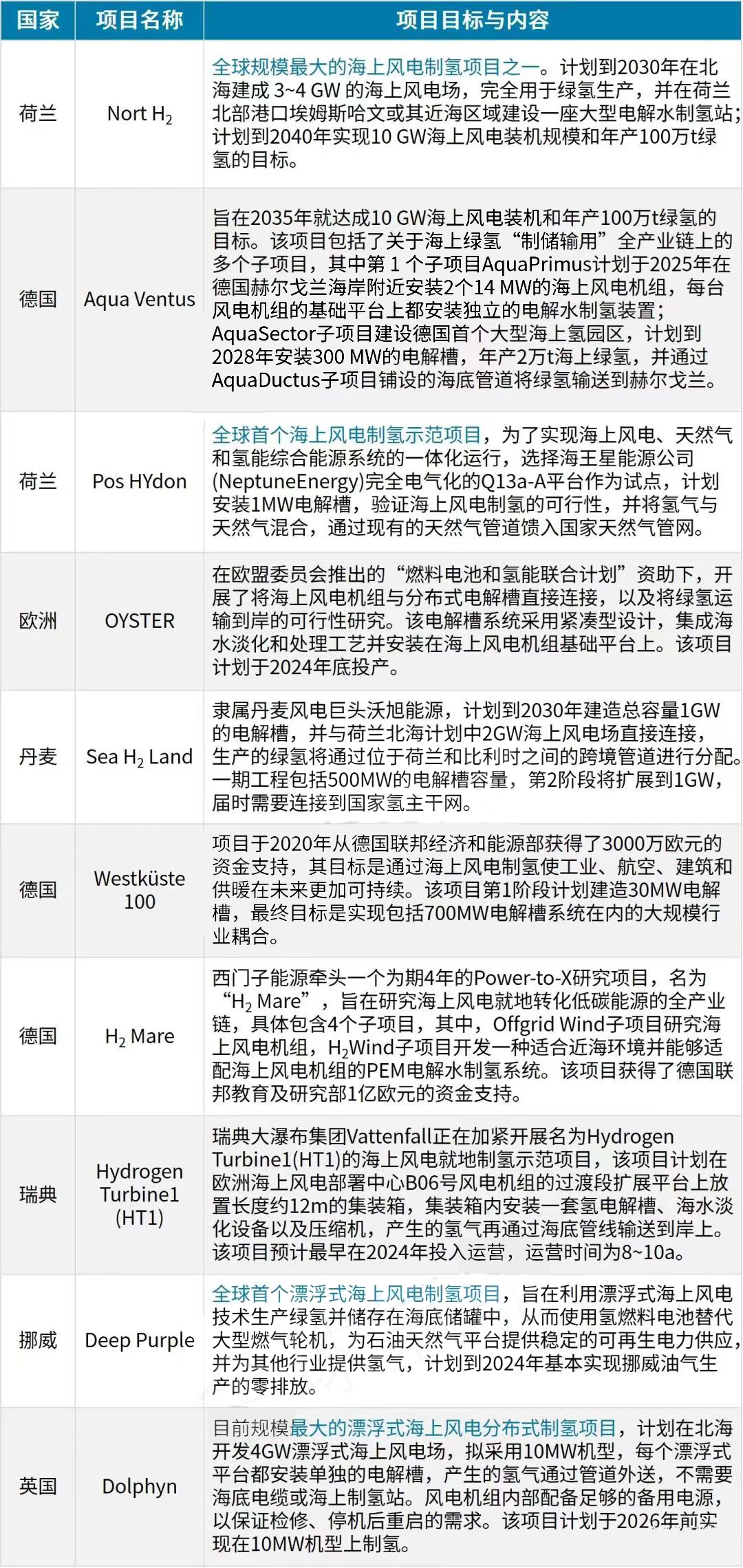 国外海上风电制氢的典型项目主要集中在欧洲,北海海域有大量的已建或待建海上风电项目作为支撑,最先进的绿氢全产业链技术在这里持续孵化,典型的项目如下图所示。