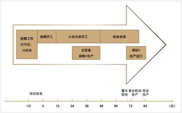 抽水蓄能电站建设周期大多在7-8年。前期一般需要经历站址选点、项目意向签约、预可研及可研编制审查等环节,项目核准权在能源领域“放管服”背景下已由国家层面转交至地方发改委。抽水蓄能电站建设具体时间线见下图。