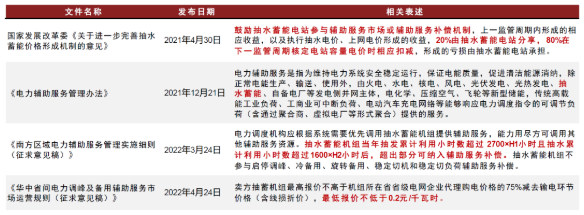 抽水蓄能逐步纳入辅助服务补偿机制。抽水蓄能是电网重要的辅助服务资源。过去,由于辅助服务补偿机制的不完善,抽水蓄能的辅助服务价值主要通过容量电费(即“包干价”)来体现。当前,部分地区在新版“两个细则”中已将抽水蓄能纳入,并且给定了补偿标准,但实际补偿电量比例仍然较低。未来,随着辅助服务品种多元化和补偿机制的完善,抽水蓄能有望通过提供市场化或有偿的辅助服务获得收益。