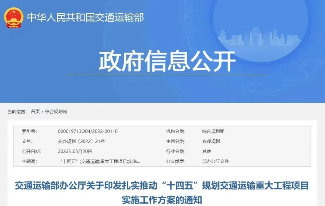 为深入贯彻党中央、国务院关于加快推进“十四五”规划重大工程项目建设的决策部署,经交通运输部同意,现将《关于扎实推动“十四五”规划交通运输重大工程项目实施的工作方案》印发给你们。请各单位各部门加强组织领导,压紧压实责任,细化实化工作措施,认真抓好贯彻落实,确保交通运输重大工程项目建设取得实效,为保持经济运行在合理区间、保持社会大局稳定作出积极贡献,以优异成绩迎接党的二十大胜利召开。