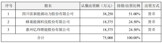 6月13日,川能动力发布公告,公司决定与亿纬锂能、蜂巢能源共同组建合资公司——四川能投德阿锂业有限责任公司,拟投资建设3万吨/年锂盐项目。据电池中国了解,新设合资公司注册资本为7.5亿元,其中川能动力出资3.83亿元,持股比例为51%,为合资公司控股股东;亿纬锂能和蜂巢能源各出资1.84亿元,分别持股24.5%。