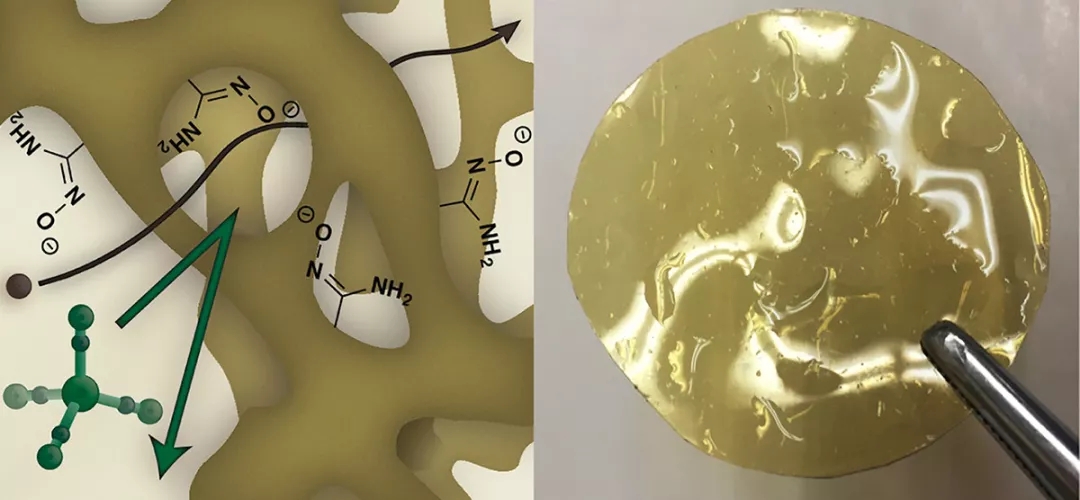 (左):AquaPIM 由特种的聚合物制成,它能在高pH值的情况下变得离子化,生成可高度导电并具有高度选择性的孔。(右)这种材料可以被塑造成各种形状,例如一种独立式的膜。(图片来源:Brett Helms/Berkeley Lab)