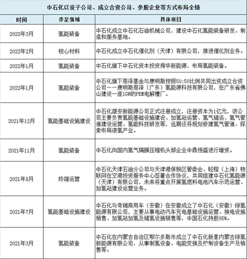 中国石化提出加快发展以氢能为核心的新能源业务,构建从烃到氢的氢能产业链,打造中国第一氢能公司。2021年建成加氢站74座,投运54座,占中国已建成加氢站的1/3