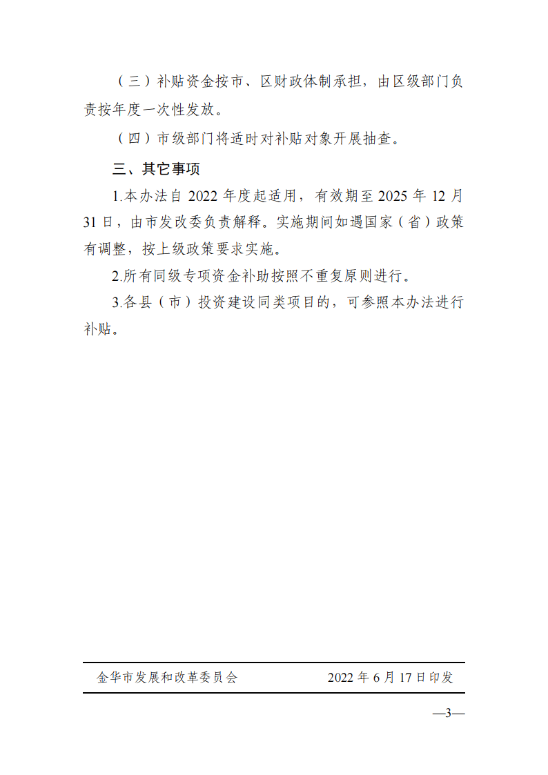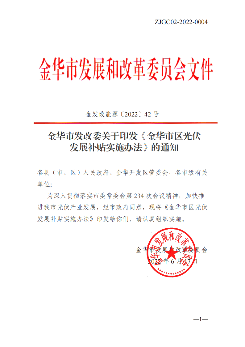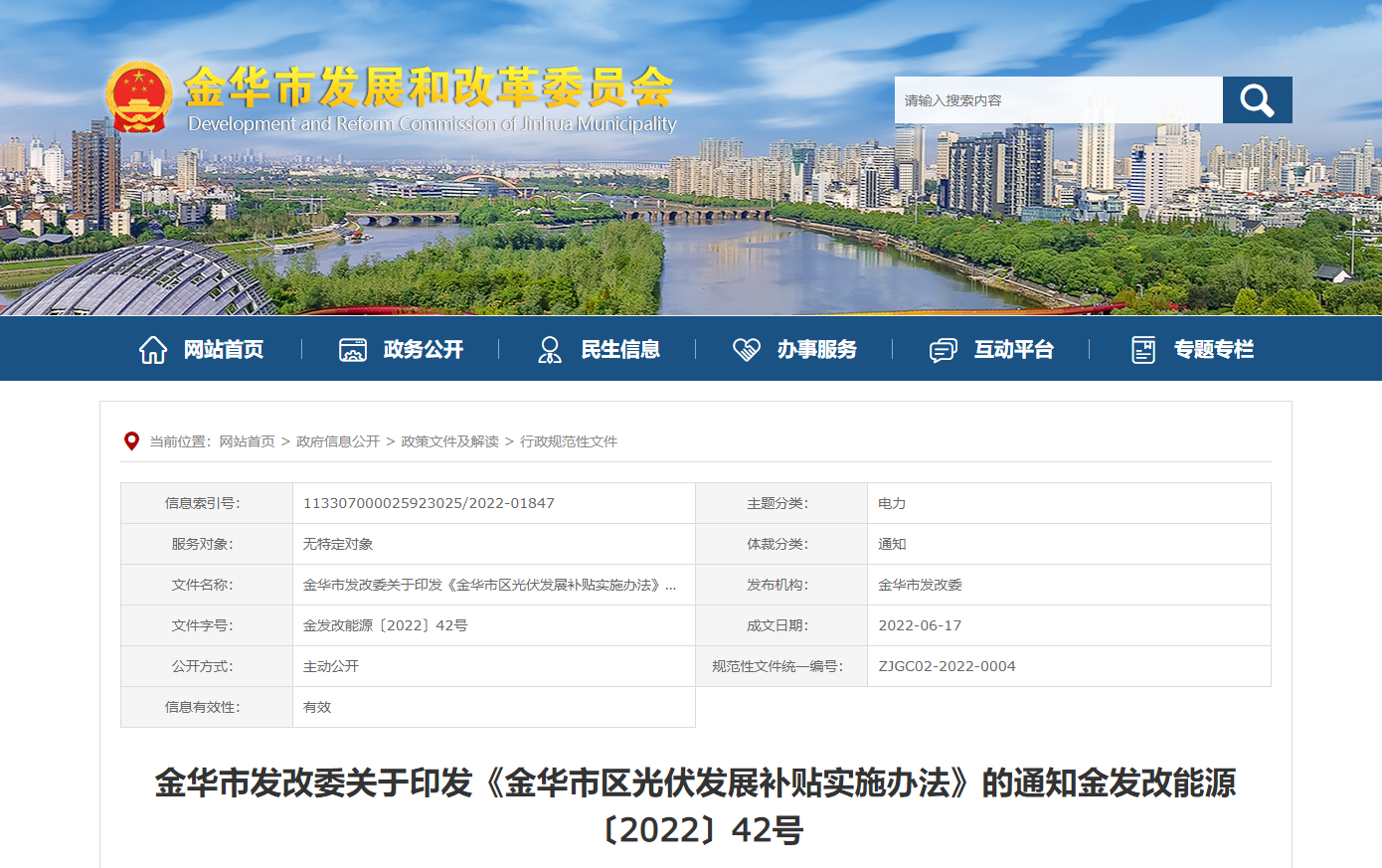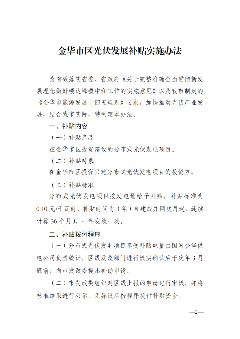 6月20日,金华市发改委发布金华市发改委关于印发《金华市区光伏发展补贴实施办法》的通知,其中明确,对在金华市区投资兴建分布式光伏发电项目的投资方,分布式光伏发电项目按发电量给予补贴,补贴标准为0.10元/千瓦时,补贴时间为3年(自建成并网次月起,连续计算36个月),一年发放一次。
