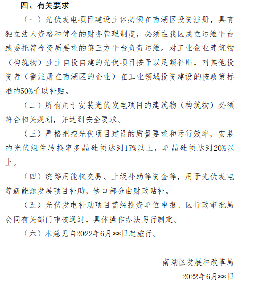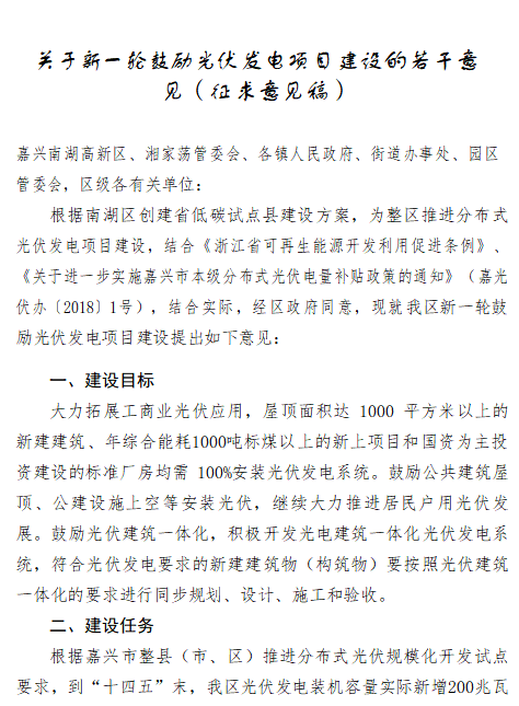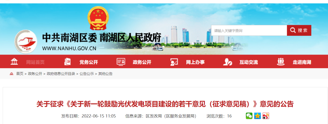 中共南湖区委、南湖区人民政府发布关于征求《关于新一轮鼓励光伏发电项目建设的若干意见(征求意见稿)意见的公告》。