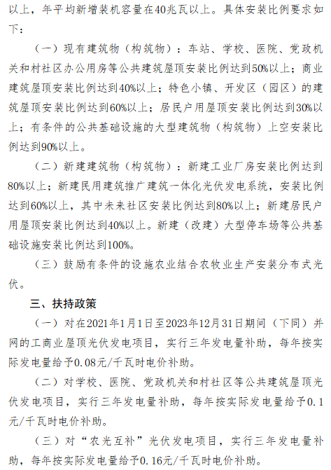 (一)对在2021年1月1日至2023年12月31日期间(下同)并网的工商业屋顶光伏发电项目,实行三年发电量补助,每年按实际发电量给予0.08元/千瓦时电价补助。
