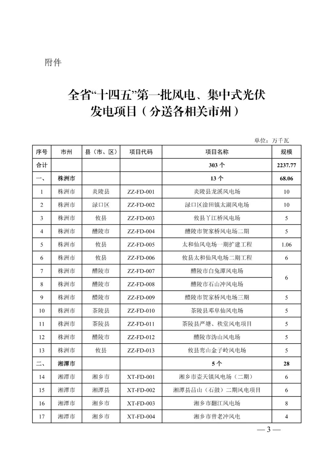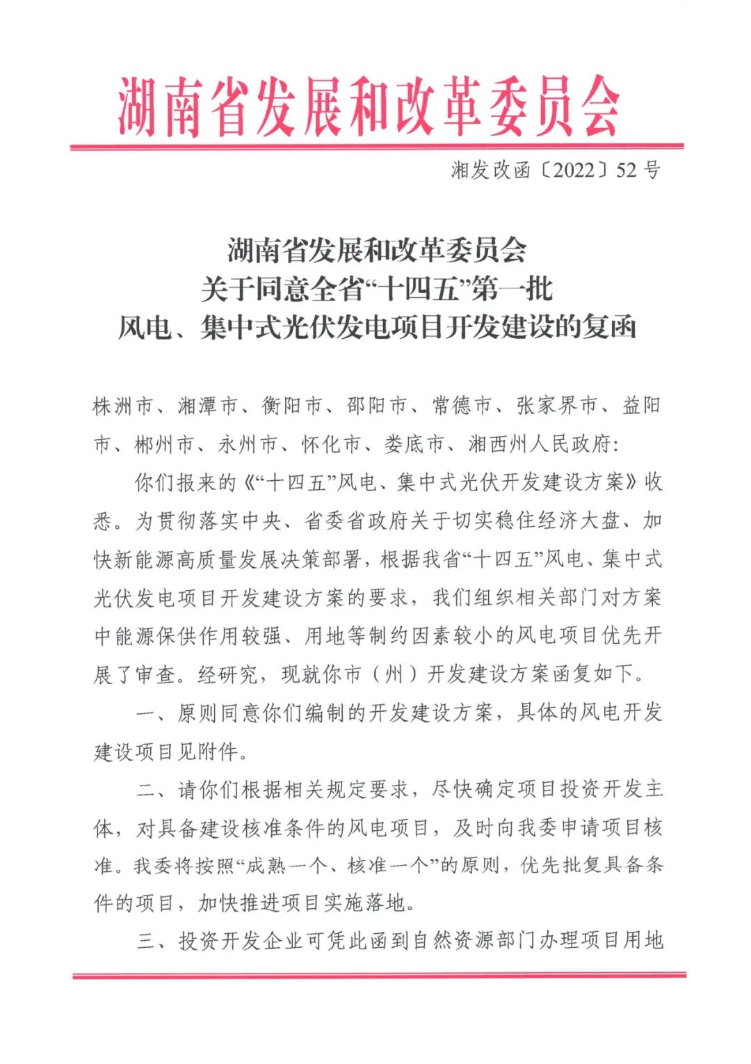 6月21日,湖南省发改委发布《关于同意全省“十四五”第一批风电、集中式光伏发电项目开发建设的复函》。