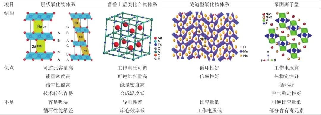 与锂离子电池类似,按正极材料分,钠离子电池主要有层状氧化物、隧道型氧化物、普鲁士蓝类化合物和聚阴离子型化合物体系,各体系特点见表1。