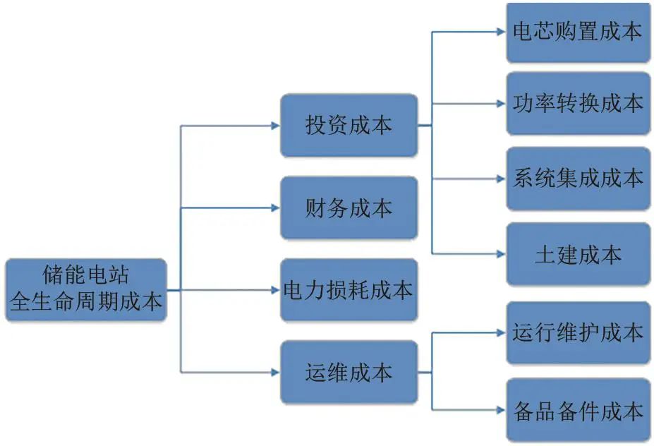 对于电化学储能电站工程,其全生命周期过程包括建设阶段、运行阶段和投资回报阶段。本文将钠离子电池储能电站的全寿命周期成本分为投资成本、财务成本、运维成本和电力损耗成本4个部分,其成本结构如图3所示。