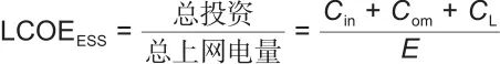 式中,LCOEESS为储能系统平准化全寿命度电成本,元/(kWh);Cin为初始投资成本,即储能系统建设时投入的成本,通常包括设计、硬件、软件、工程、采购、施工等产生的总费用;Com为运行维护成本,即储能系统在每年运行和维护过程中产生的费用,包含容量维护成本、功率维护成本和人工运营成本;CL为电力损耗成本,即储能系统在全生命周期内从电网或其他能源电源处充放电花费的所有费用;E为系统全生命周期上网电量,指储能系统每年向电网输出的电量,与储能系统的放电效率、储能容量、年循环次数和放电深度等有关。
