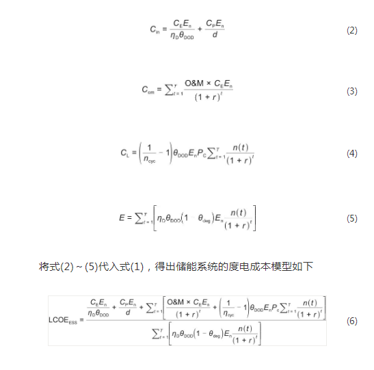 对于各种储能技术,以储能系统的放电电量为准,采用平准化电力成本(LCOS)方法来分析比较不同储能技术的成本。本文考虑到钠离子电池应用于储能电站的成本,主要来源于电池系统的前期初始投资成本、运行维护成本以及电力损耗,故本文主要分析储能电站电池系统的度电成本;并充分考虑电池的运行特性和寿命特征,建立的储能电站电池系统的度电成本计算模型如下